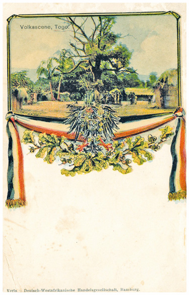 01.12.1909: farbige patriotische Litho-Ansichtskarte "Volksscene, Togo" (Dorfidylle mit Kaiserreich Heraltik) aus "Nuatjä" mit beschädigter 5Pf Marke.