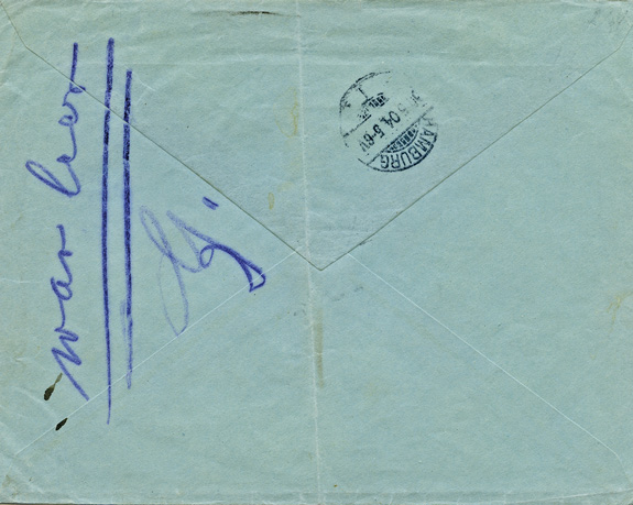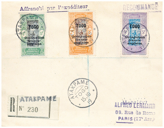 15.10.1919, Französische Besetzung: 1Fr, 2Fr und 5Fr (M.39,40,41) mit je Stempel ATAKPAME TOGO auf R-Brief nach Paris. Rückseitig deutscher Transitstempel ANECHO (17.10) sowie französische Stempel GRAND-POPO DAHOMEY (18.10) und COTONOU DAHOMEY (19.10).
