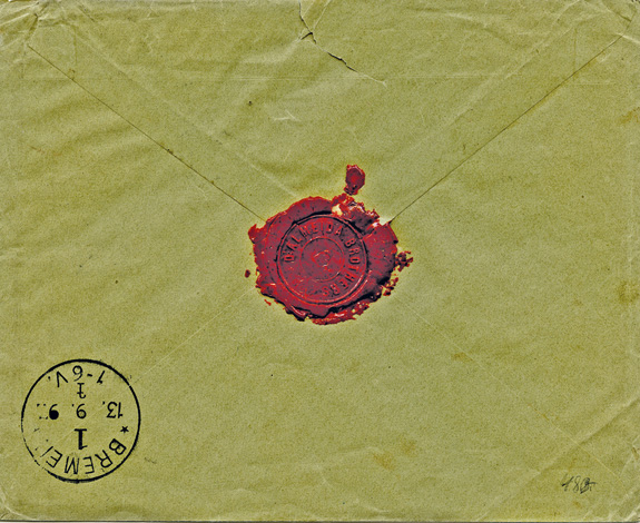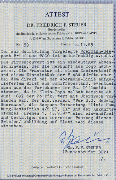 04.08.1897: portogerechter Firmenbrief "d'Almeida Brothers &Co., Klein-Popo" mit 4x 20Pf (Mi.V48d) und 4x Seepoststempel DSLHW "IX" und Weiterleitungsvermerk "Per S S Hedwig Woermann" an Herrn Paul in BREMEN (rückseitiger Ankunftsstempel vom 13.9.1897 sowie rotes Lacksiegel der Firma). Beförderungsspuren und kleiner Einriß oben; Attest Dr.Steuer.