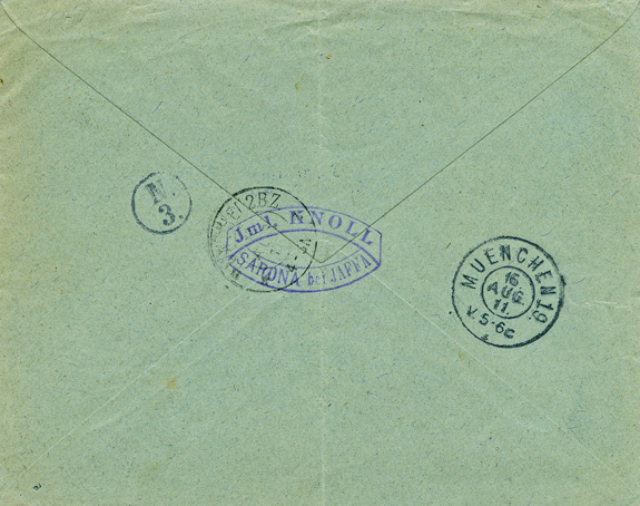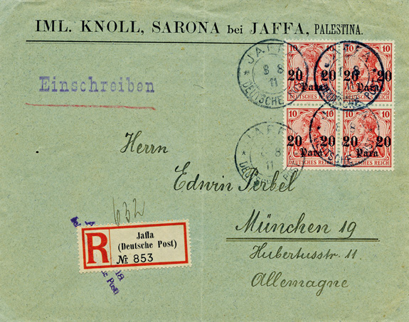 08.08.1911: Viererblock 20 Para (Mi.37b) mit 4x Stempel JAFFA auf Vordruckbrief "IML.KNOLL, SARONA bei JAFFA, PALESTINA" als Einschreiben mit R-Zettel "Jaffa" (Type 7) nach MÜNCHEN (16.8.11, Ankunftsstempel rückseitig); R-Zettel verdeckt teilweise violetten L2 "Aus Sarona / bei Jaffa (Deutsche Post)". Mittelbug.