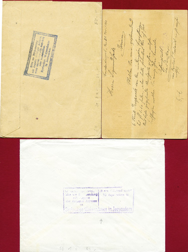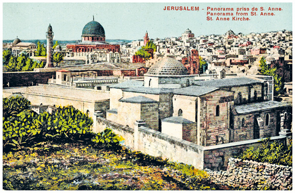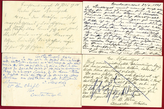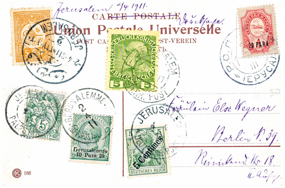 April 1911: Souvenir-Ansichtskarte mit Panorama von Jerusalem & unterschiedlichen Freimarken von 6 verschiedenen Postverwaltungen mit entsprechenden Poststempeln.