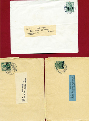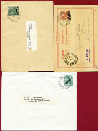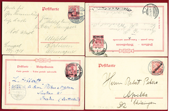 1891-1914: Lot von 10 gebrauchten und ordentlich gestempelten verschiedenen Belegen der Deutsche Post Türkei; Ganzsachenkarten 5 x rot, 5x grün dabei Streifbänder und zwei Briefe als Ganzsache.