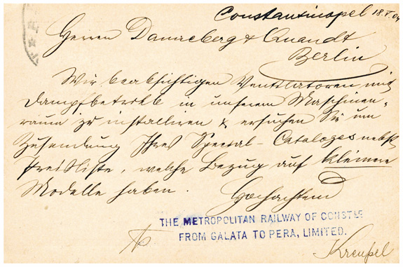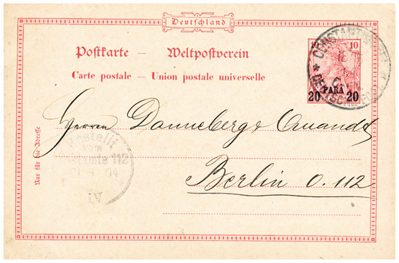18.05.04: 20 Para GSK (Mi.P7) mit Stempel CONSTANTINOPEL nach Berlin (21.5.04); rs Absenderstempel "The Metropolitan Railway of Const´le / from Galata to Pera, Limited" und Bedarfstext vom Betreiber des "Tünel", u.a. betr. Installation von Ventilatoren in der unterirdisch verlaufenden Standseilbahn.