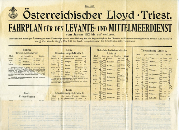 ca.1912: Fahrplan für den Levante- und Mittelmeerdienst, herausgegeben von dem Österreichischen Lloyd in Triest.