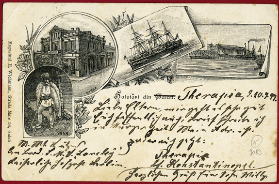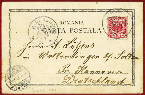 22.09.97: 10Pf Krone/Adler (Mi.47) auf früher rumänischer Ansichtskarte (Eckbüge) mit Seepoststempel MSP No.14 nach SOLTAU (27.9.97); Absender ist "M.Mt. Lütgens / An Bord S.M.S. Loreley / Kaiserliche Hofpost Berlin" von "Therapia bei Konstantinopel..".